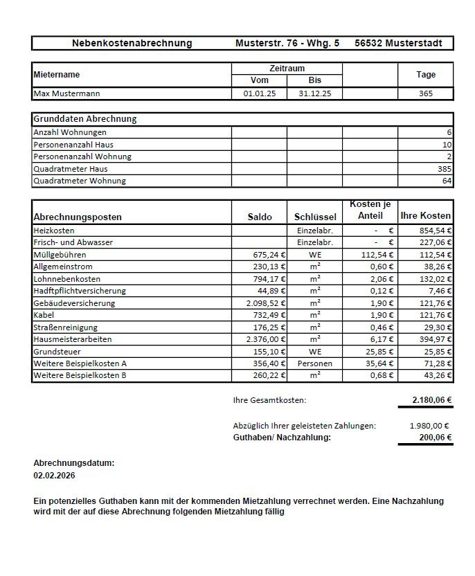 Nebenkostenabrechnung Vorlage (Excel) für Vermieter